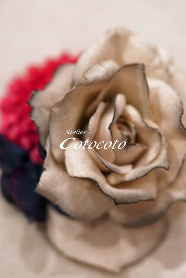 ◾️アーティフィシャルフラワーを使用しております。その特性上、使用を重ねると繊維が出ているように見えることがあります。また、一つ一つ染色を施した素材を使用しており、アンティークな風合いを大切にしているため、色むらに見えたりする部分がありますが、デザインの特性・味わいとしてあらかじめご理解いただいたうえでご注文ください。