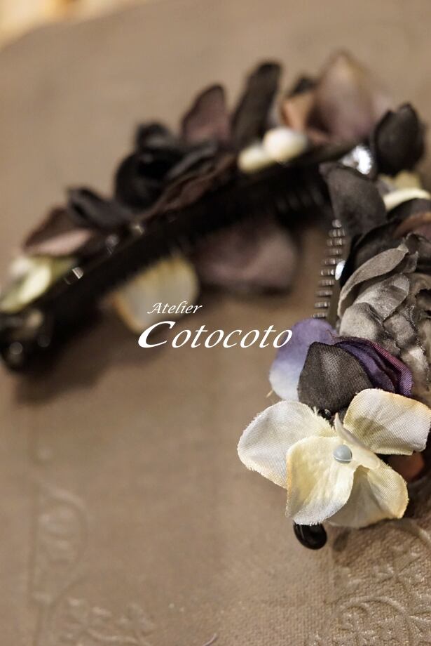 【手染めの布花を使った一点モノのバナナクリップ。横顔でちょっと差をつけたい。ブラック系はオフィスでも悪目立ちしないので大好評】