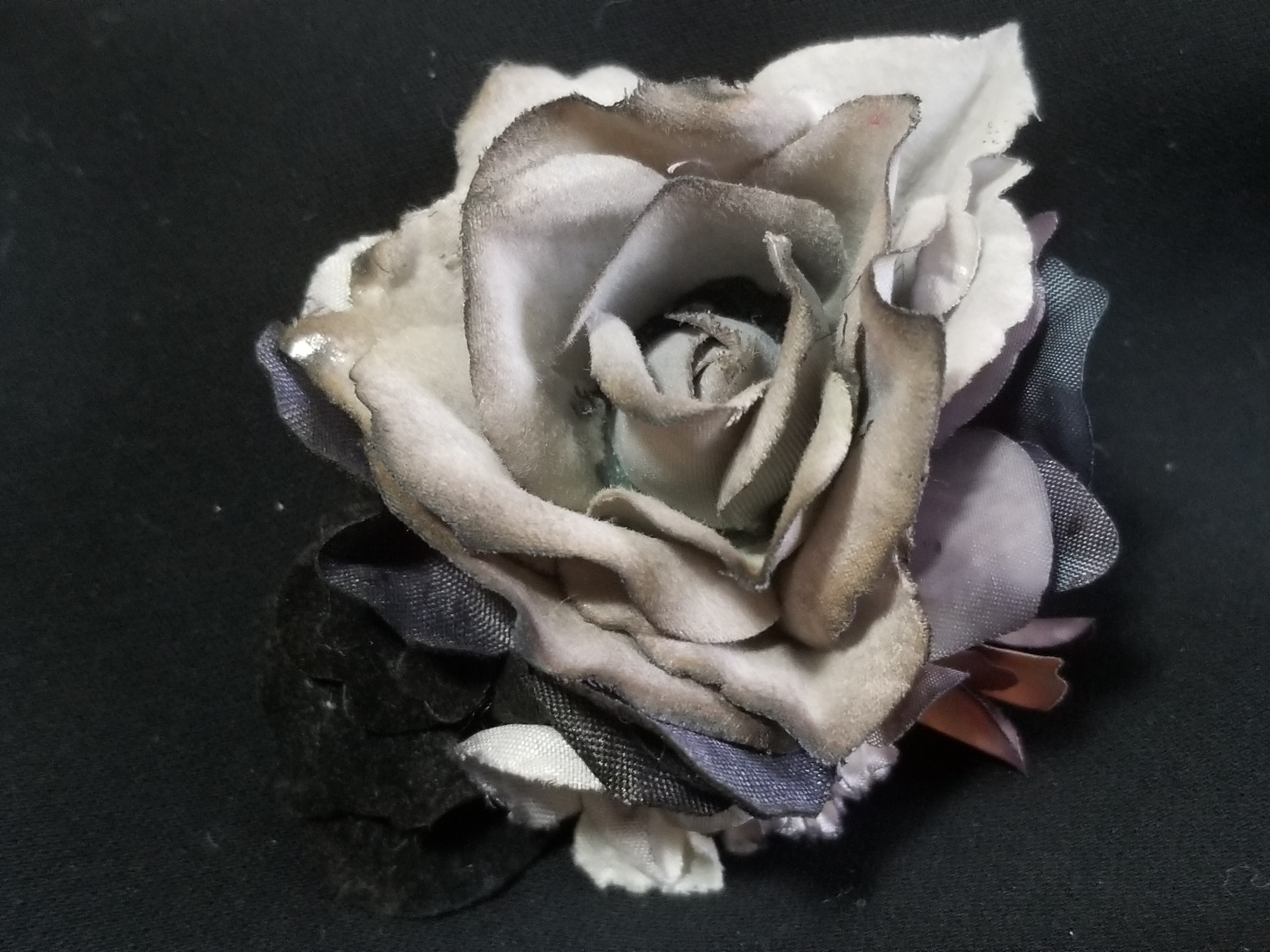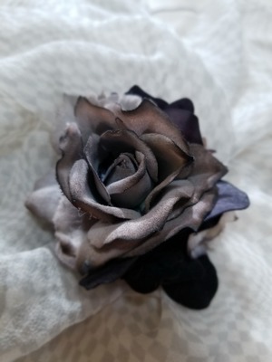 黒、白、暖色、寒色を柔らかく発色させた布花で包まれたバラが、