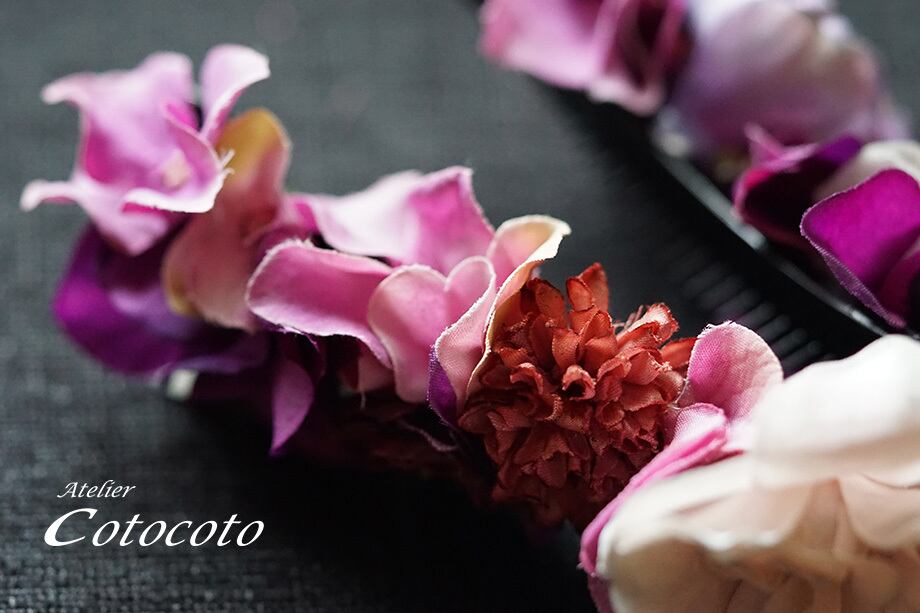 ◾️アーティフィシャルフラワーを使用しております。その特性上、使用を重ねると繊維が出ているように見えることがあります。また、一つ一つ染色を施した素材を使用しており、アンティークな風合いを大切にしているため、色むらに見えたりする部分がありますが、デザインの特性・味わいとしてあらかじめご理解いただいたうえでご注文ください。